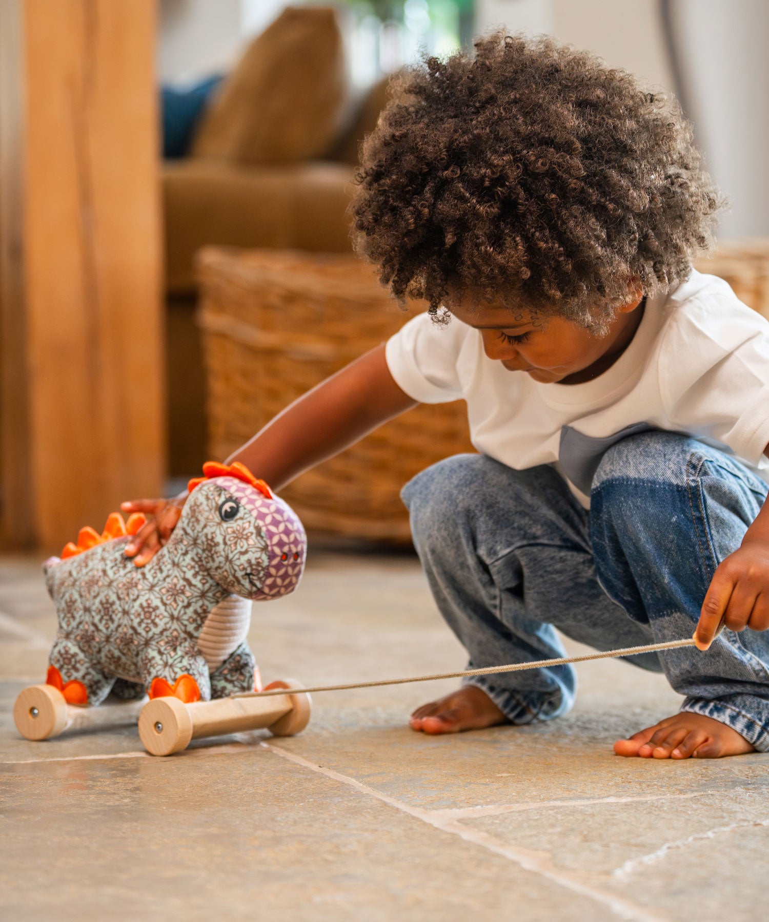 Perfect for children aged 6 months+, Digley begins life as a cuddly companion. Then, with a quick clip to his smart wooden wheels, he transforms into a playful pull-along toy for toddlers finding their feet. As little ones take him for a stroll, this cheerful toy dinosaur happily trundles behind, ready for every discovery.